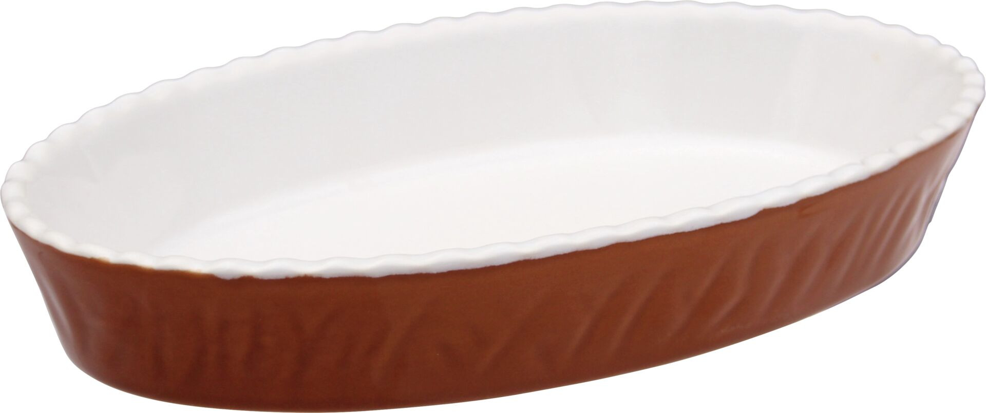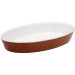 Porzellan, außen ofenbraune Glasur, innen weiß, oval. Feuerfest bis 220°C.