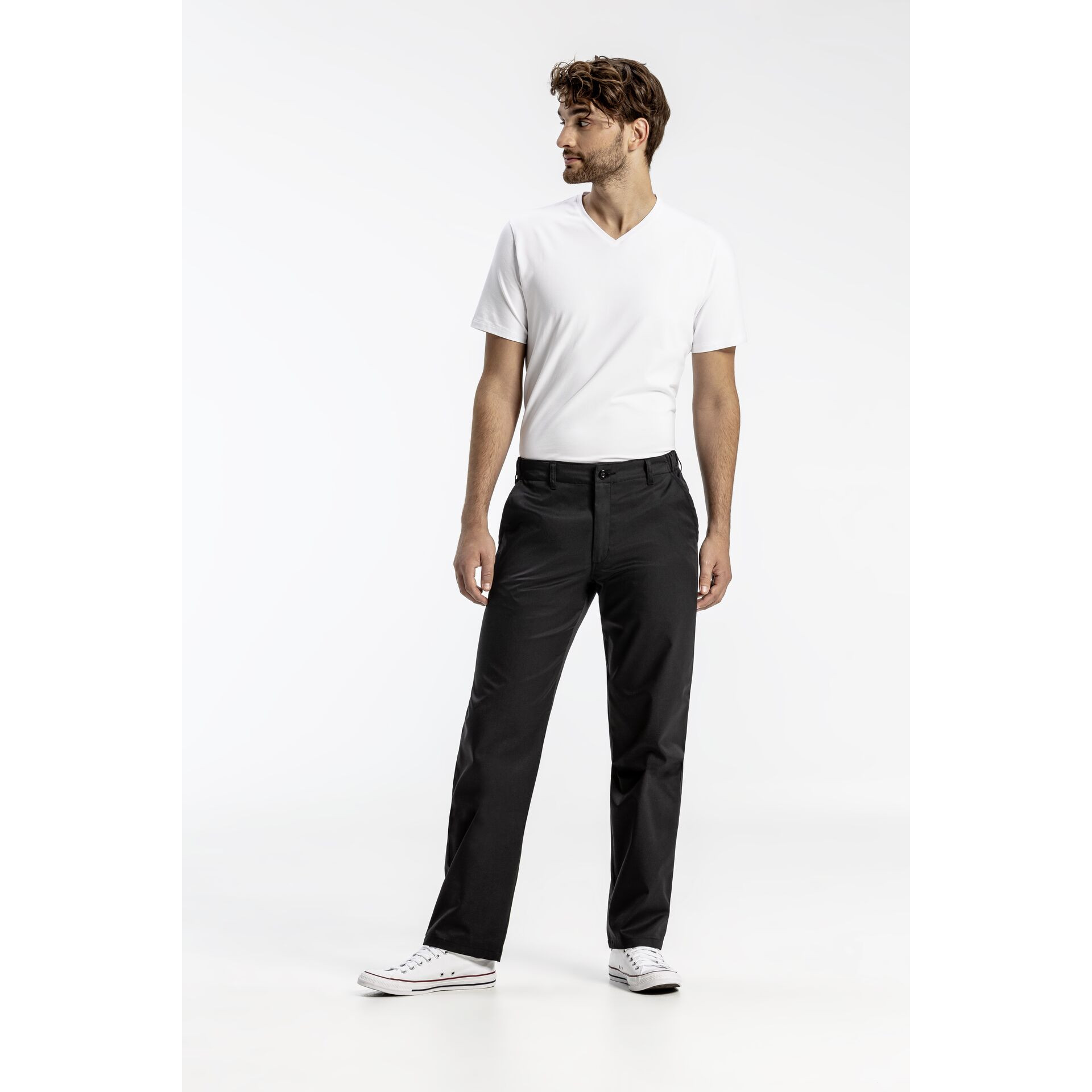 Herren-Hose regular fit, seitlicher Gummibund, 2 Seitentaschen, 1 Gesäßtasche, Gürtelschlaufen, Schrittlänge 84 cm/ Gr. 50, 35% Baumwolle/ 65% Polyester, 210g/ m², waschbar bei 95 °C.