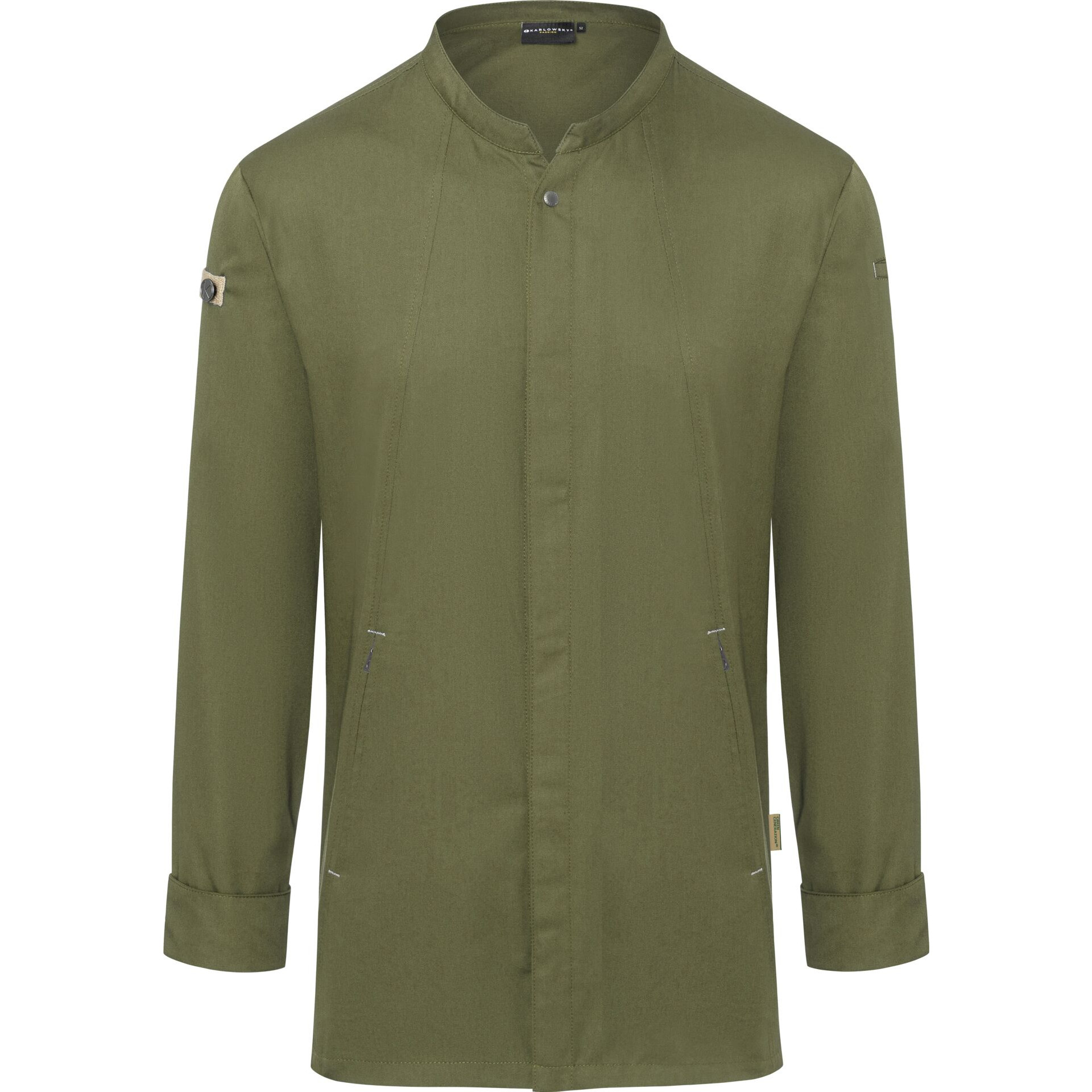 Farbe: moosgrün. Vorderteil 65 % Polyester (recycelt), 35 % Baumwolle, Rückseite 100 % Polyester. Innovative nachhaltige Kochjacke, die urbanen Style mit natürlichen Flair verbindet. Polyesteranteil aus recyceltem Plastik, leicht tailliert geschnitten, Rückeneinsatz aus Jersey Pique sorgt für angenehme Belüftung und erhöhte Bewegungsfreiheit, mit Druckknöpfen zum schnellen Öffnen und Schließen, Ärmelmanschetten mit Druckknöpfen, Vorderteil mit Reißverschlusstaschen und Leistentasche am linken Ärmel, stylische Applikationen aus Kontrastbändern an den Ärmeln und im Nacken für eine urbane Optik.