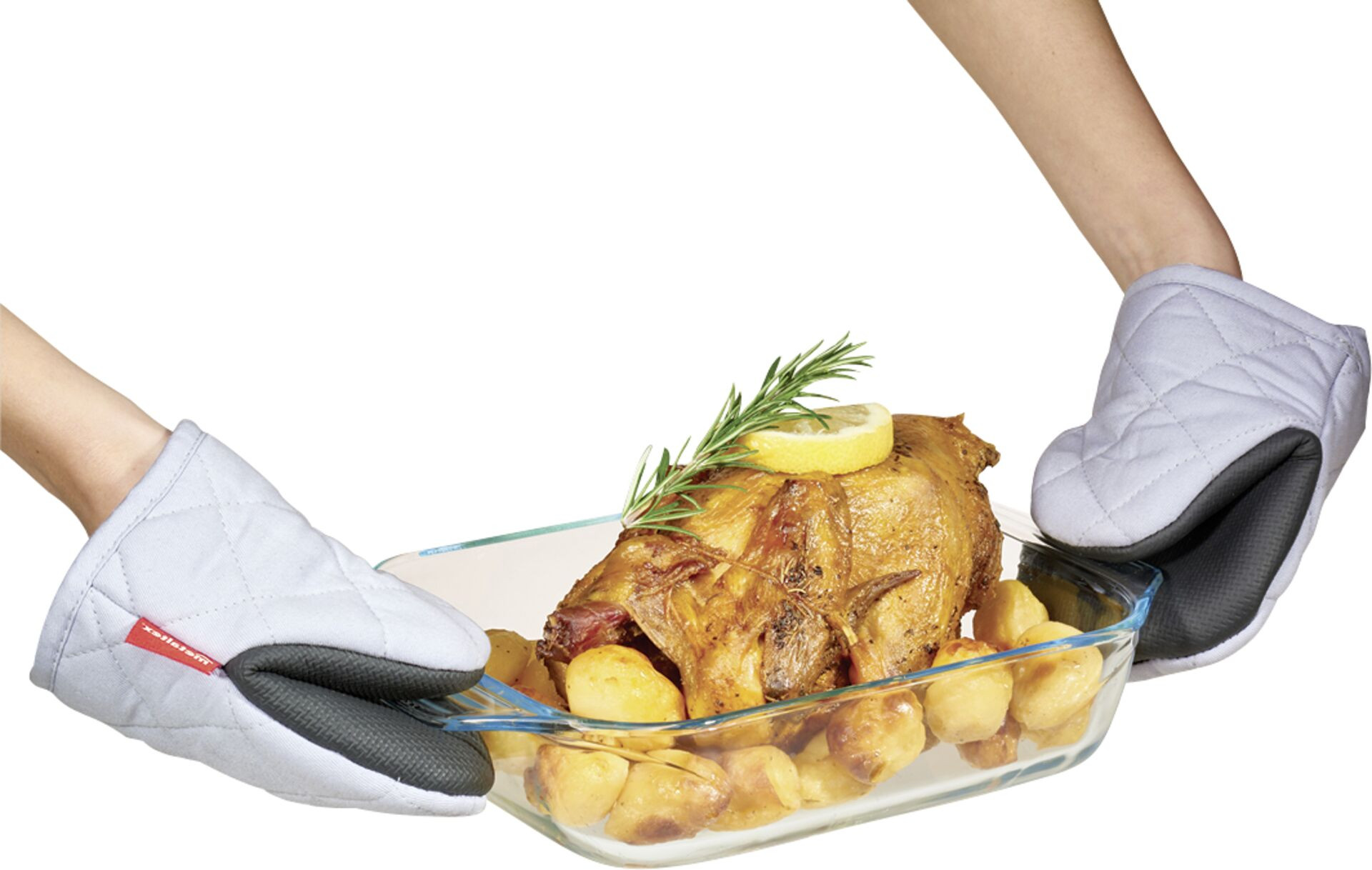 Baumwolle, Gummi, Polyester. Rutschfeste Handfläche aus Gummi. Auf Kontaktwärme geprüft: max. 250 °C für mindestens 15 Sekunden. CE zertifiziert. Im 2er Pack.