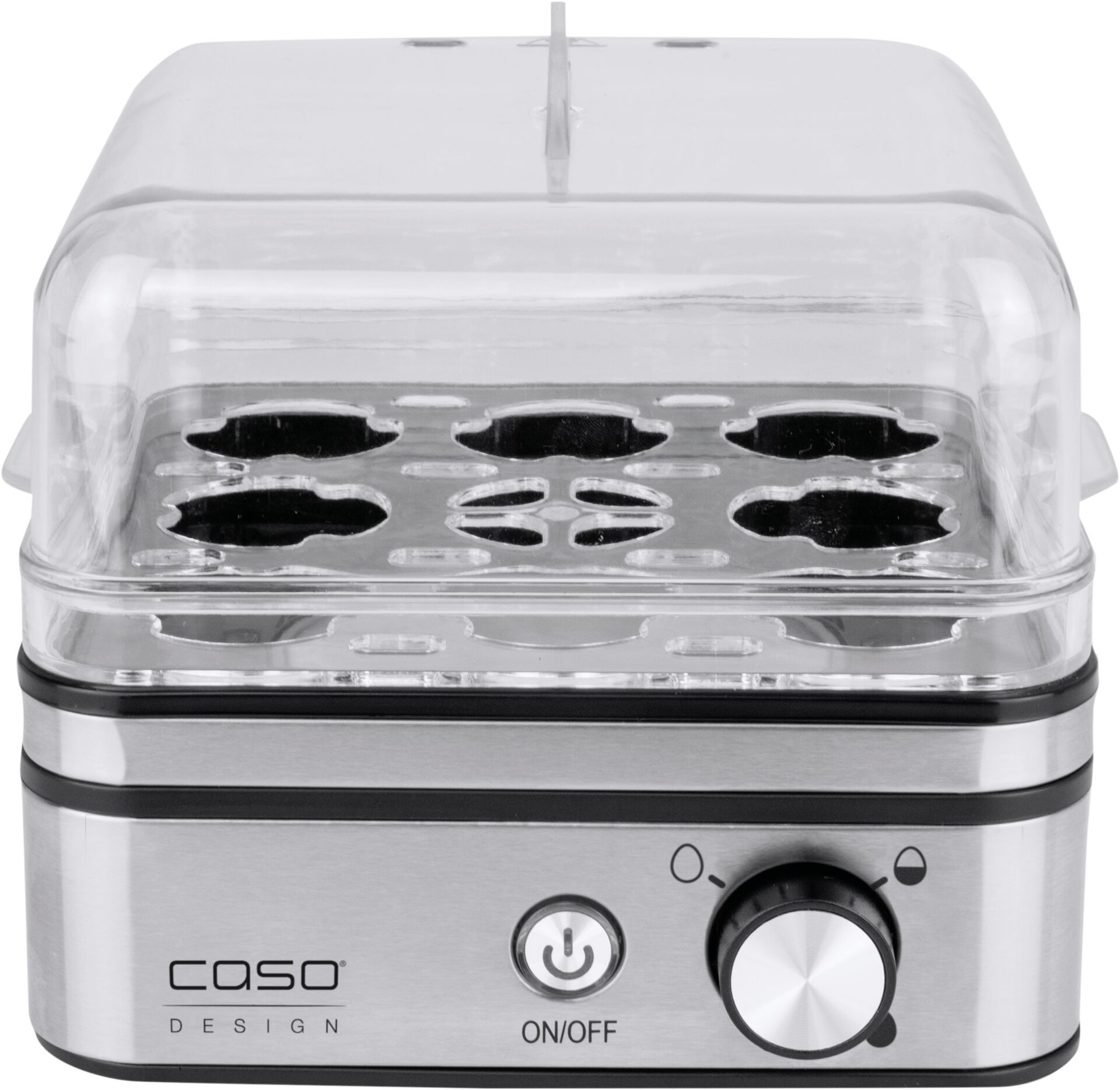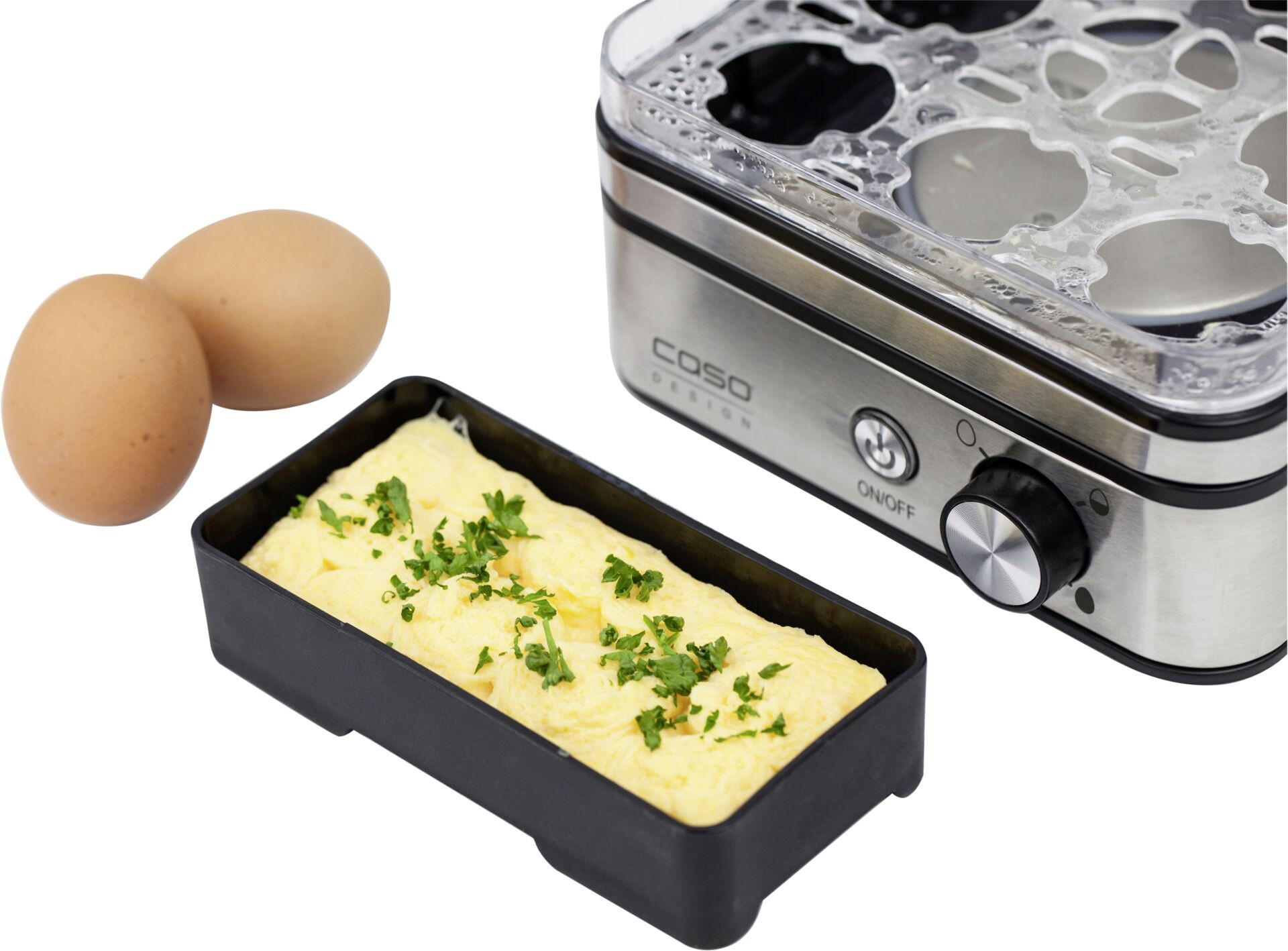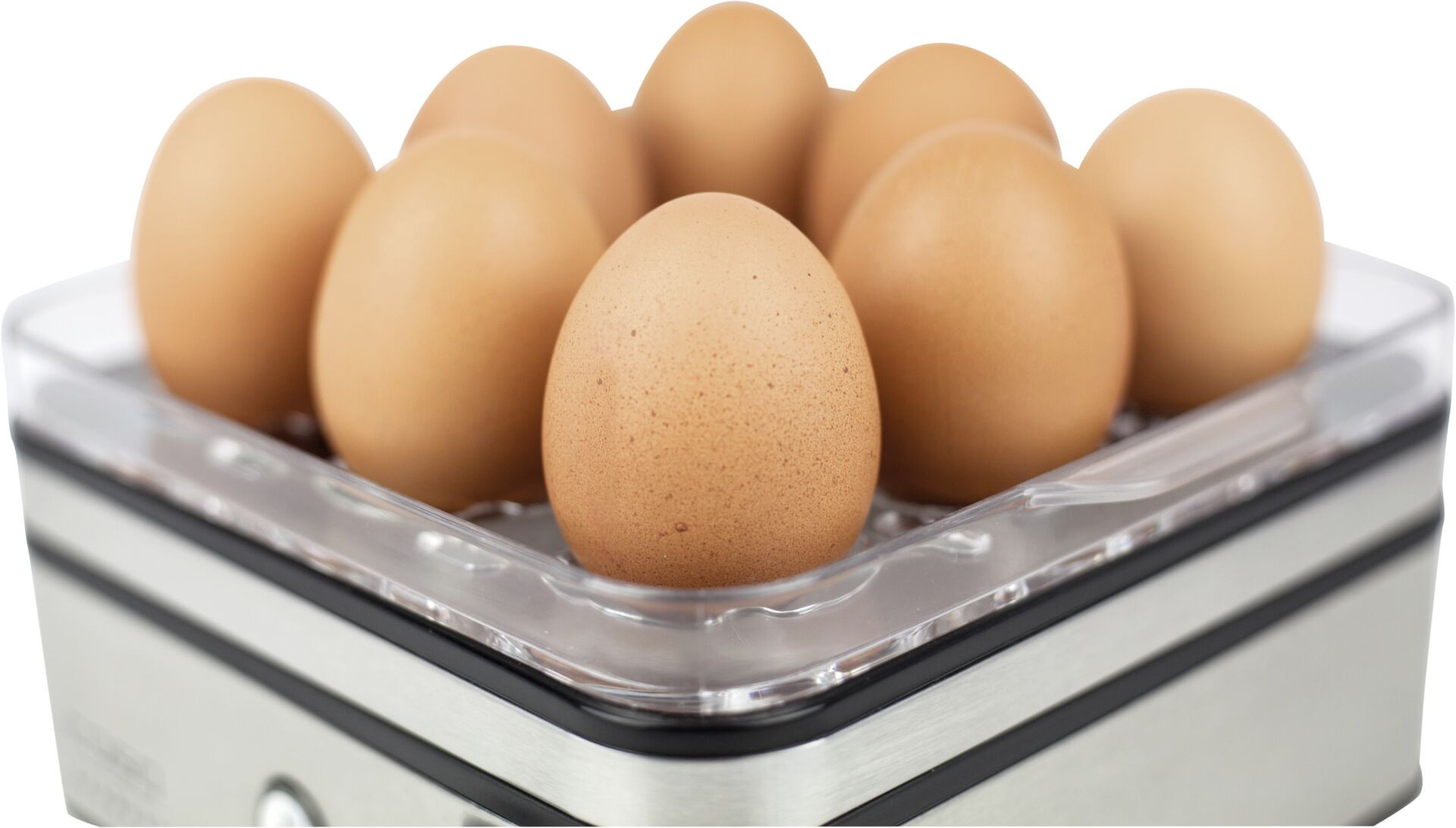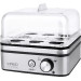 Eierkocher für bis zu acht Eier in hochwertigem Edelstahldesign. Kein Trockenkochen, keine schlechten Gerüche und kein Festbrennen von Wasserrückständen durch elektronische Regelung und frühzeitiges Abschalten. LED-Betriebsanzeige für optimale Lesbarkeit. Inkl. Messbecher mit Eipicker, zwei Pochierschalen und einer antihaftbeschichteten Kochschale.