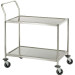 Edelstahl, rostfrei. Mit 2 Borden und 1 abgewinkeltem Griff. 4 Lenkrollen mit 2 Feststellern. Tragfähigkeit: ca. 80 kg. Selbstmontage. Bordmaße in cm: 83x51,5.