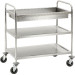 Edelstahl, rostfrei. Mit 2 Borden und extra tiefer Abräummulde. 4 Lenkrollen mit 2 Feststellern. Tragfähigkeit: ca. 120 kg. Abräummulde 100 mm tief. Maße zwischen den Borden: oben ca. 270mm, unten ca. 265 mm. Selbstmontage. Bordmaße in cm: ca. 83x51.