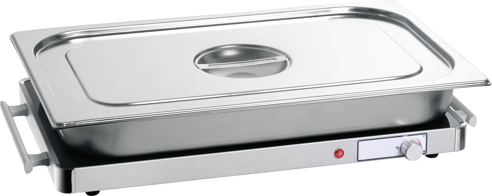 Elektro, für 1/1 GN und 2x 1/1 GN. Gehäuse aus Aluminium, Oberfläche aus Glas. Mit Ein-/Aus-Schalter, Kontrolllampe und stufenloser Temperaturregelung von 30°C bis 95°C. Oberflächentemperatur max. 95°C. Einfache Reinigung.