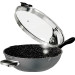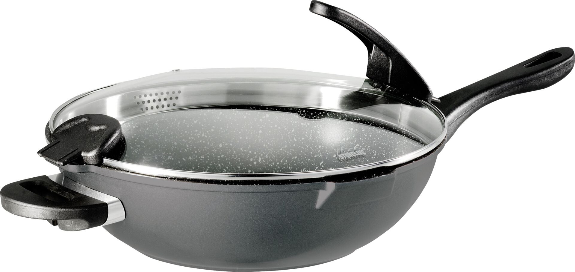Aluguss. Antihaft. Siebglasdeckel. Kunststoffgriff. Bodenstärke: 4,5mm. 2 breite Ausgüsse und Spezialdeckel mit Siebfunktion, Flüssigkeit fließt wieder zurück in die Pfanne dank Deckelhalterung. Robuste, harte und kratzfeste Beschichtung. Gesund und fettfrei Braten wie auf Naturstein, schnelle und gleichmäßige Wärmeübertragung. Hitzebständig bis 180°C. Für alle Herdarten geeignet, auch Induktion.